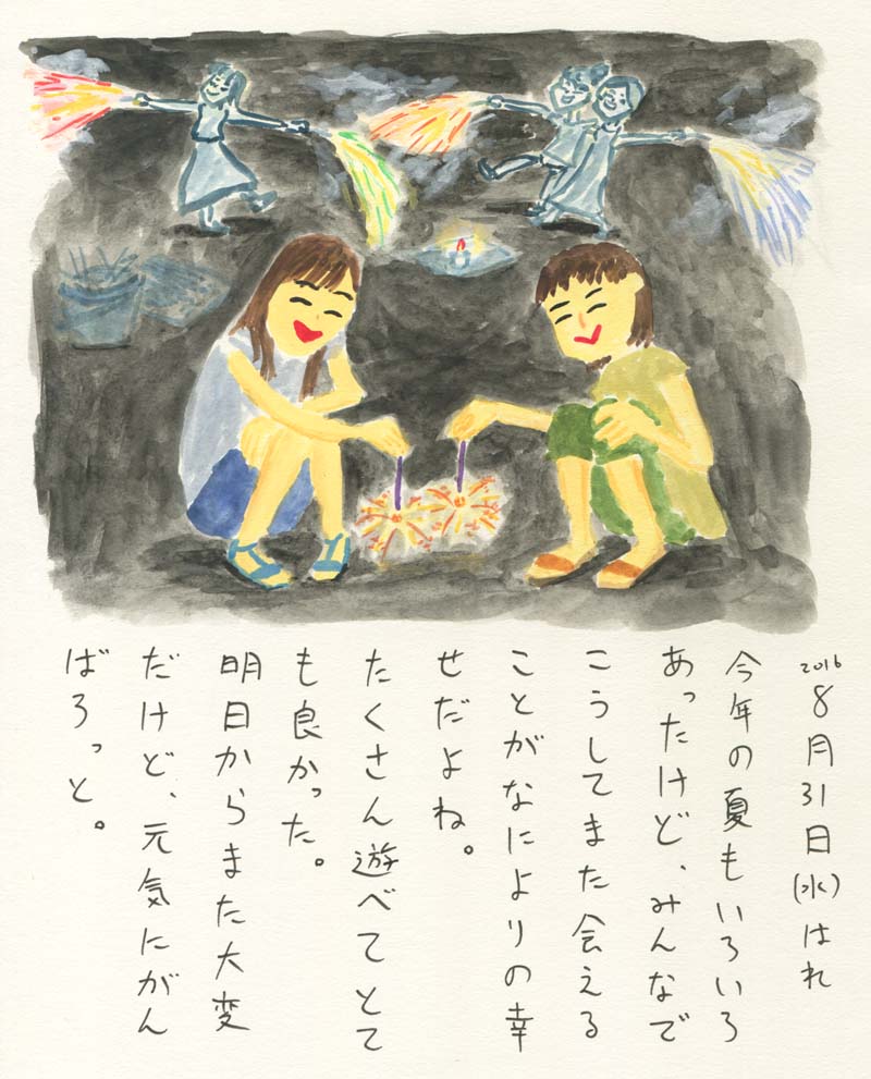 全部で31枚の絵日記を描くことで8月1日から8月31日まで1カ月間の絵日記が完成しました。絵日記の内容は文章を頂いたのではなく、完全にぼくの想像なのですが、「こんなことあったかもしれない夏」をテーマに描かせていただきました。